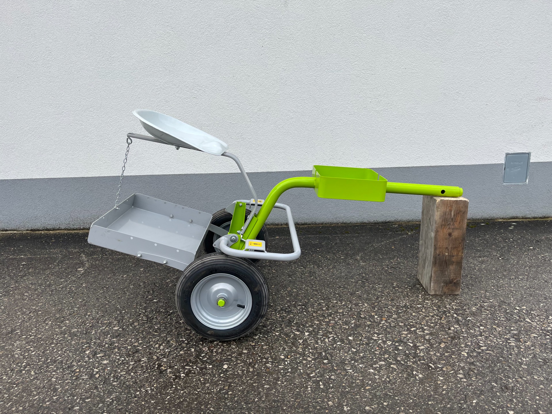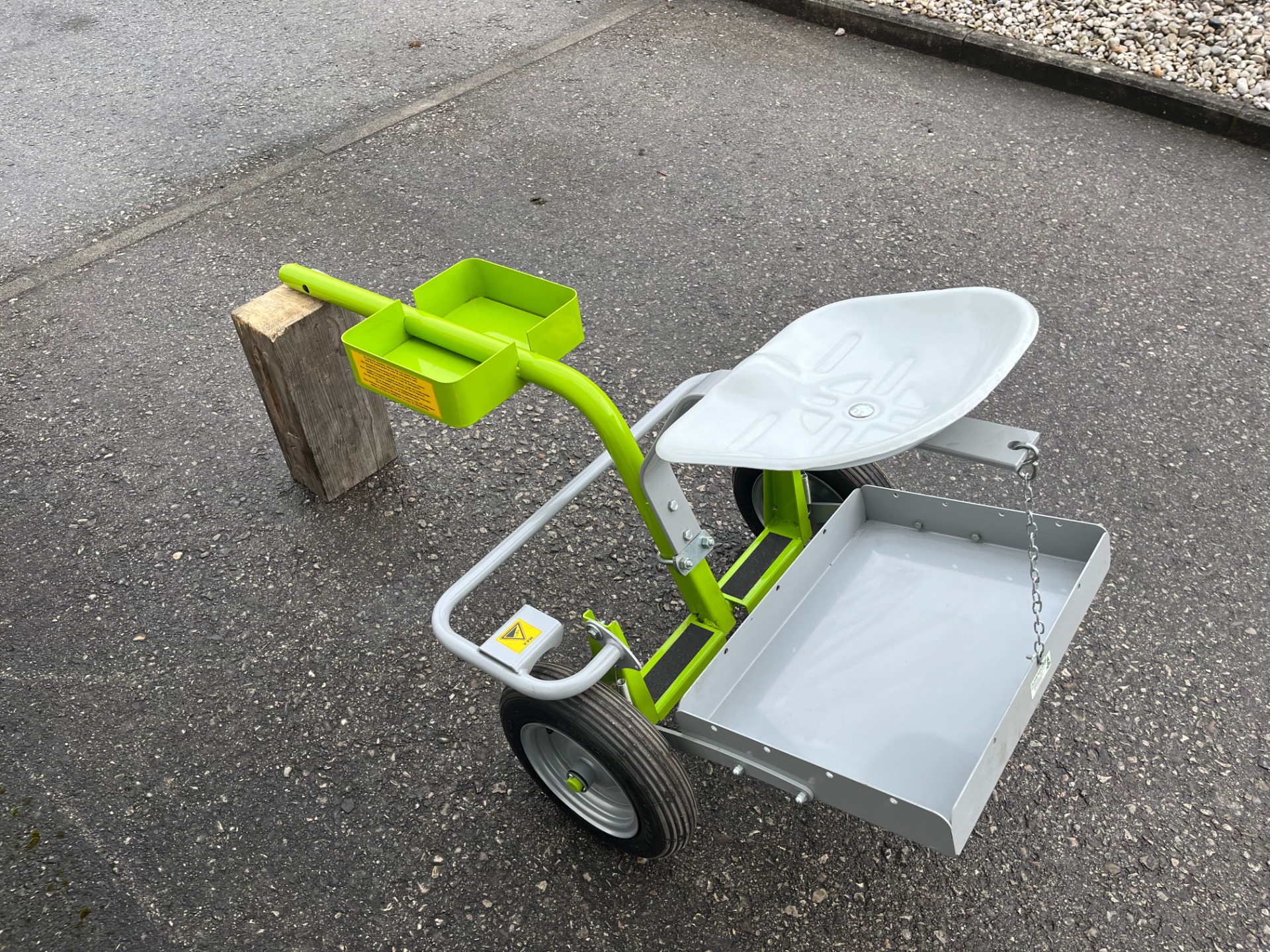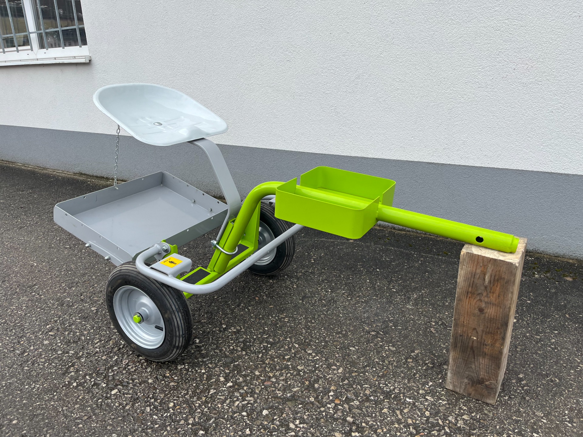 Der Anschluss erfolgt unkompliziert über einen Splint und einen Stift, wodurch ein rascher Wechsel jederzeit möglich ist. Der Sitzwagen wird direkt hinter dem Einachsschlepper angebracht und ermöglicht ein angenehmes und ergonomisches Arbeiten im Sitzen.